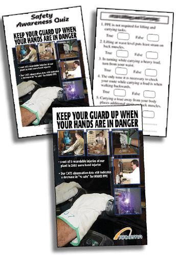 The safety cards provide each employee with a copy of pertinent safety information. The quizzes give helpful discussion points during the meeting and also document attendance. If safety incentives are offered, the quizzes can be used for a safety draw.